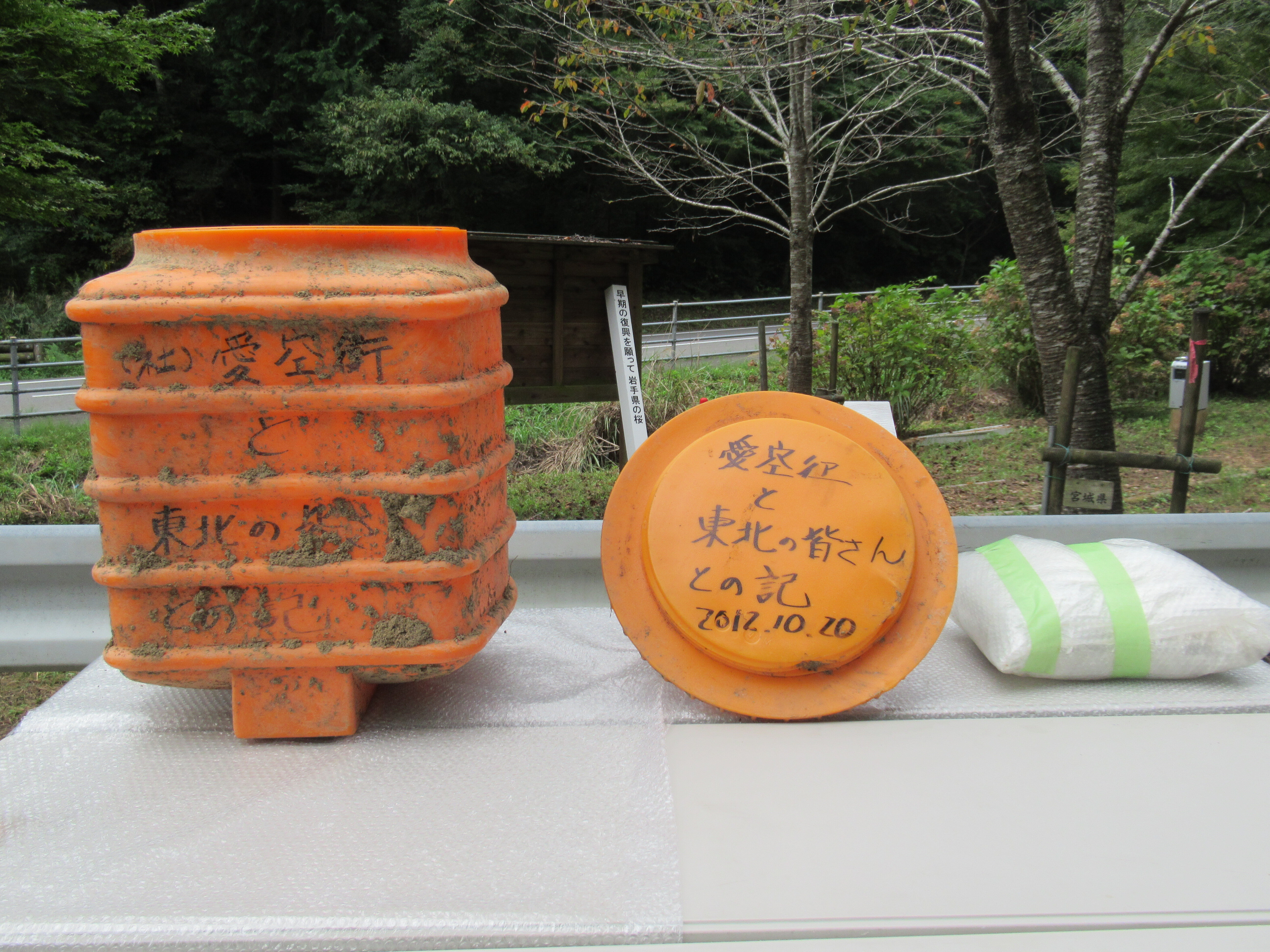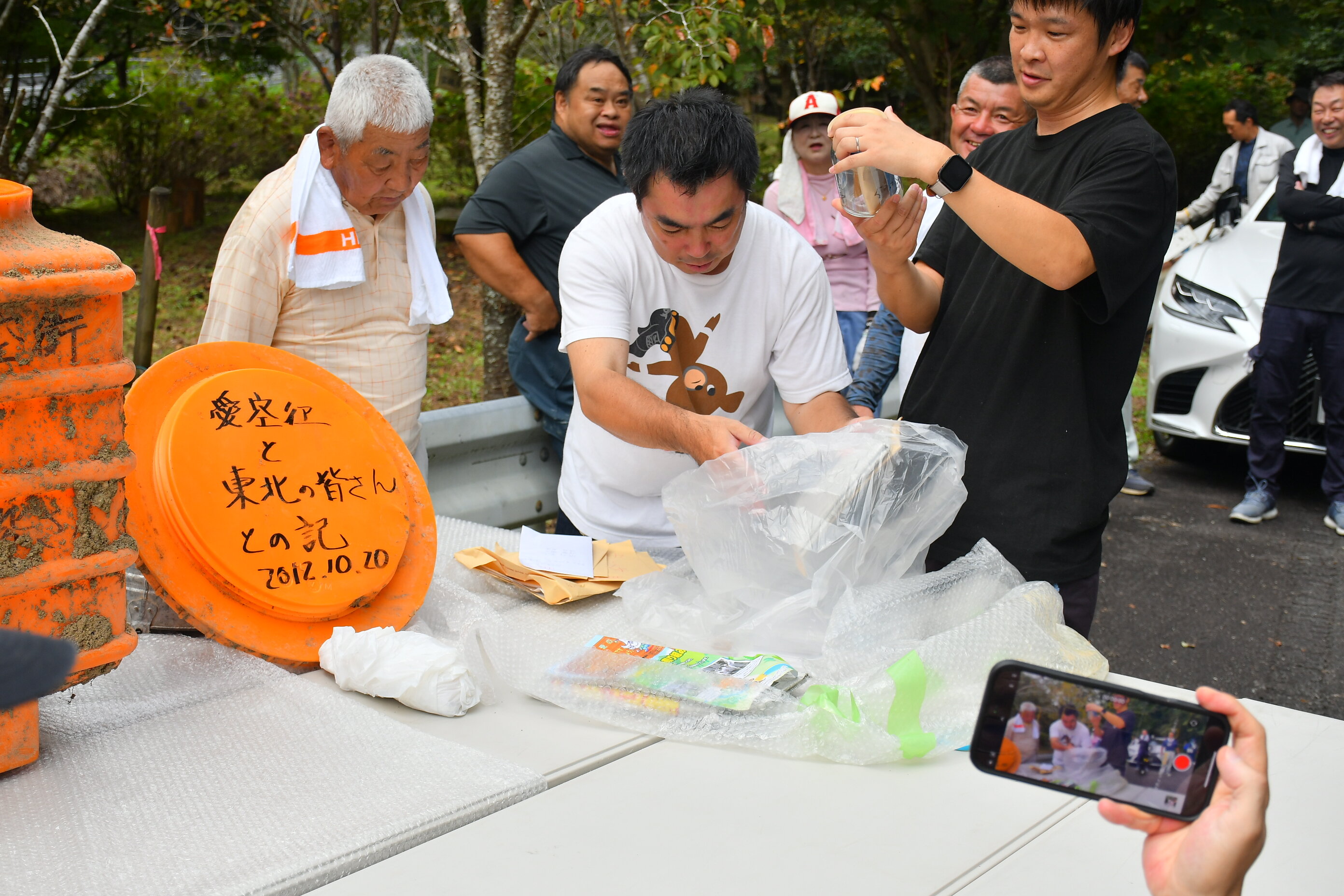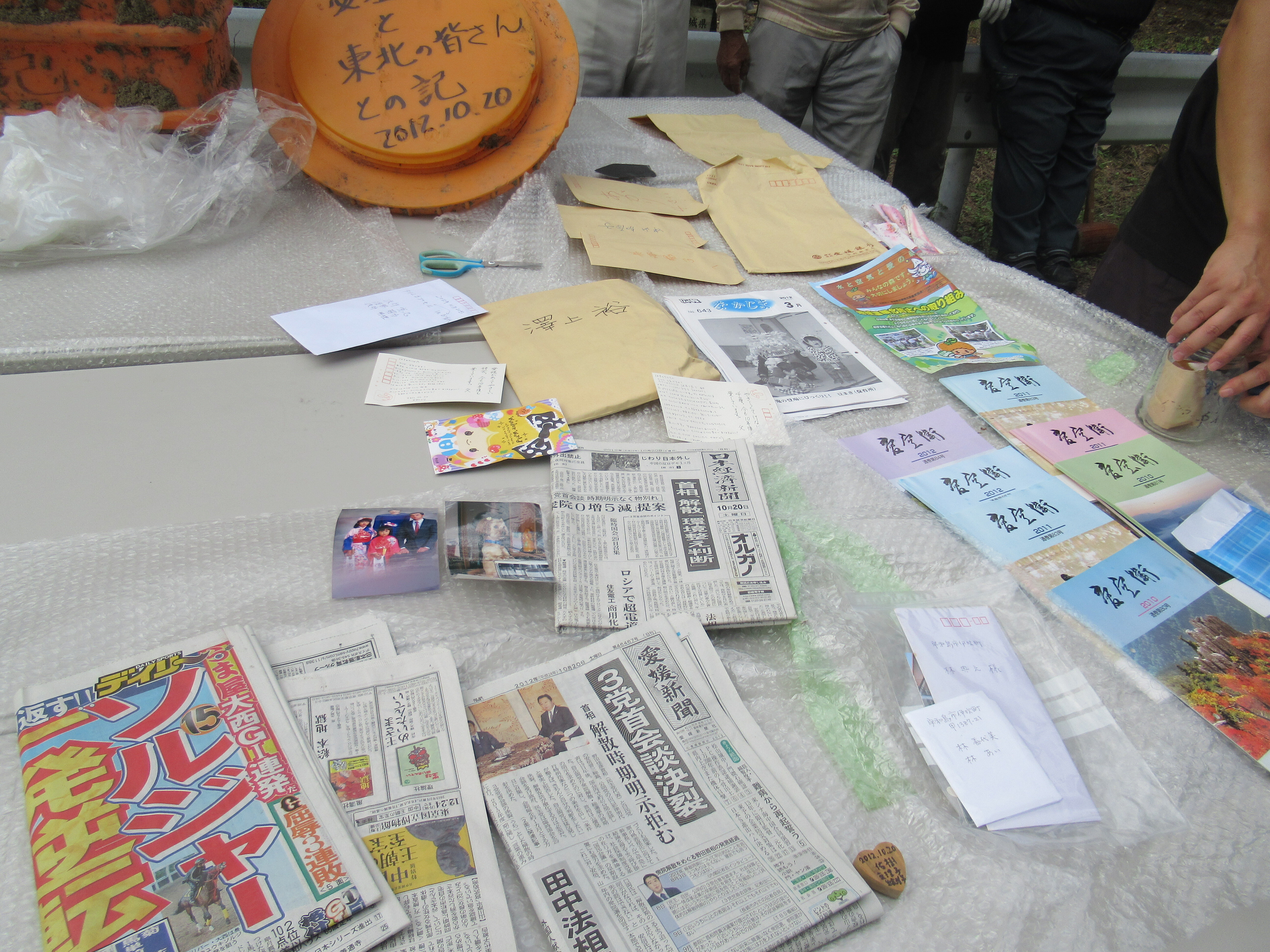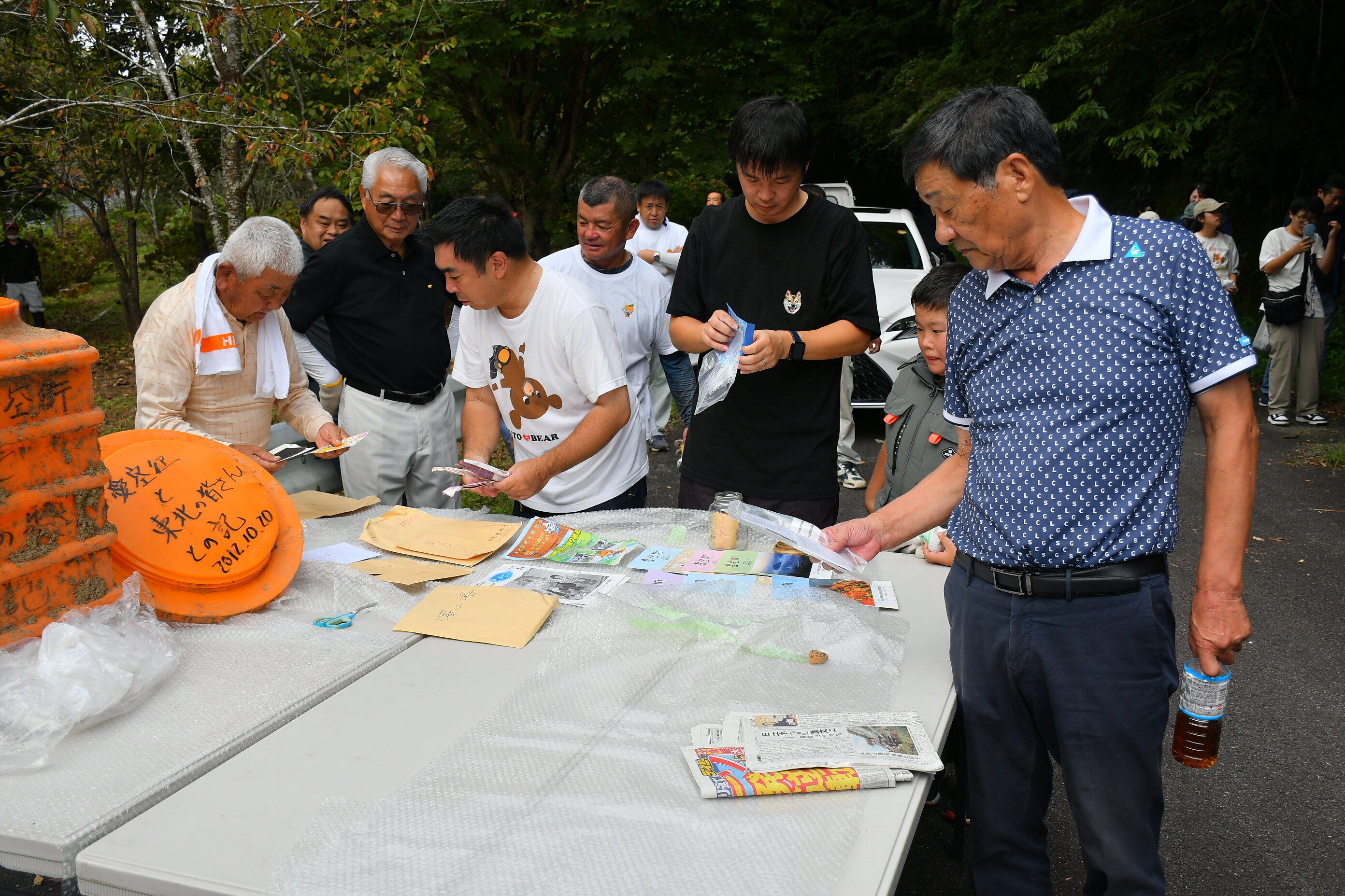 全員が公園入口に戻ってからのタイムカプセル開封は、当時の活動参加者名簿にあった2名の方に開封作業をお願いし、中身の確認では当時の新聞や協会機関誌、そして未来の自分などへ宛てたと思われる手紙などが出てきて、自分や家族の関係品と判明したものは持ち帰ってもらいました。(残った品は協会事務局で当面保管)