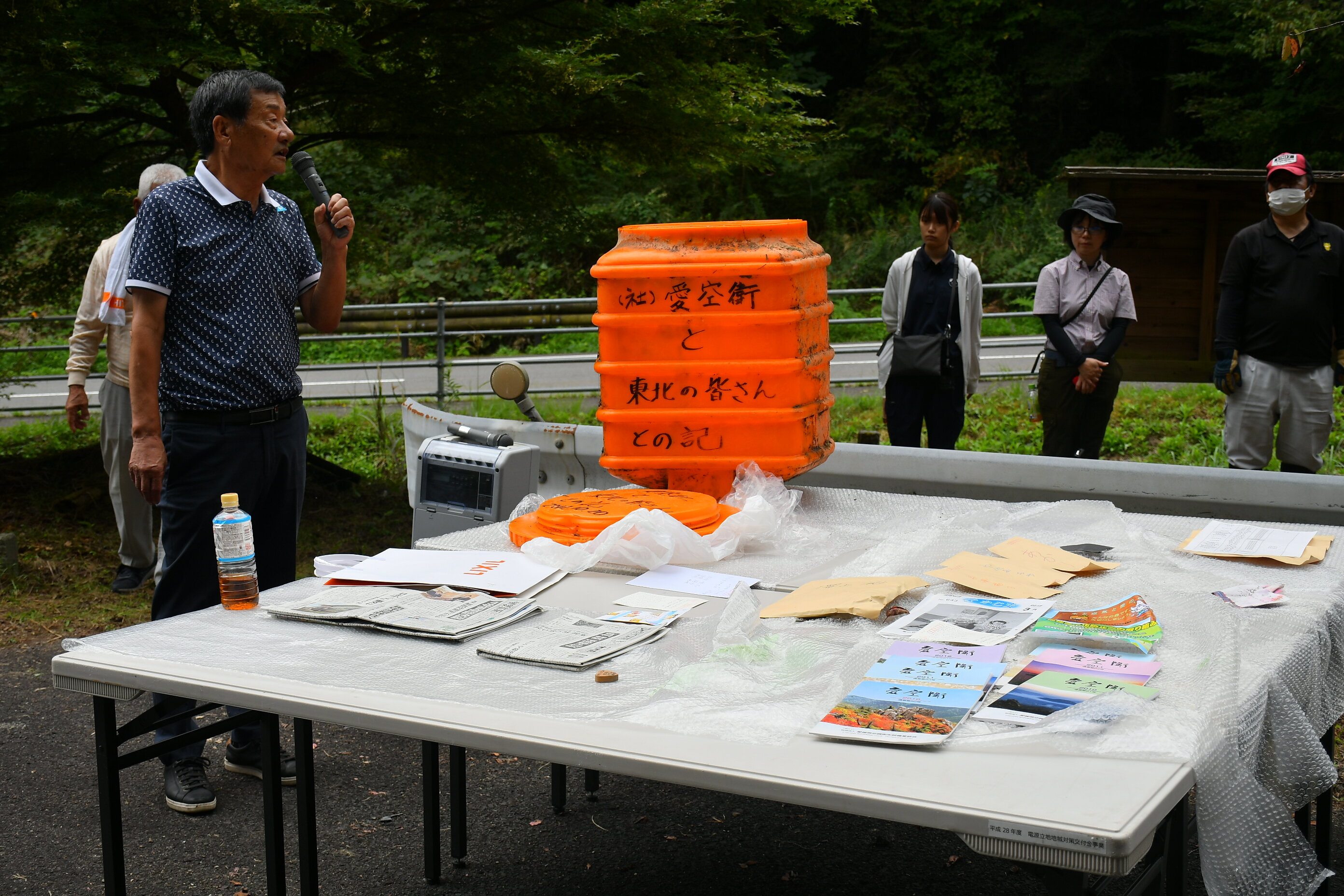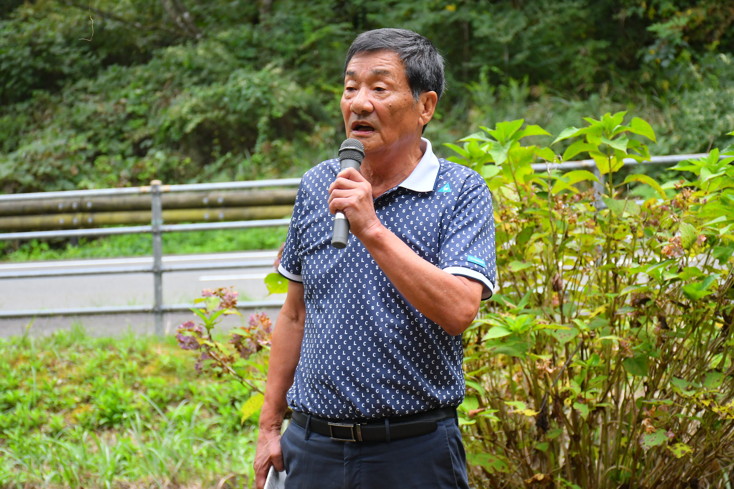 開会で土居会長から、「県や町の職員を含め、休日ながら68名も参加してくれたことと、準備に奔走してくれた広報委員に対し感謝します。この活動は平成23年、今から14年前に始まりました。その年3月に起きた東日本大震災を受け東北復興を祈念する桜を植えていたところ、偶然にも隣の県道を福島テレビのクルーが88箇所巡礼企画で通りかかり同局で放送されました。翌年の活動では東北から避難してきた「えひめ311」の方も交えてタイムカプセルを埋めたのですが、協会設立50周年の関連行事として今年開封します。地道にやってきた成果も少しずつ出てきており、子どもも楽しめるような活動を、時代の変化に対応しながらこれからも10年やっていきたいと思います。」と、感謝の思いと意気込みを交えた挨拶がありました。