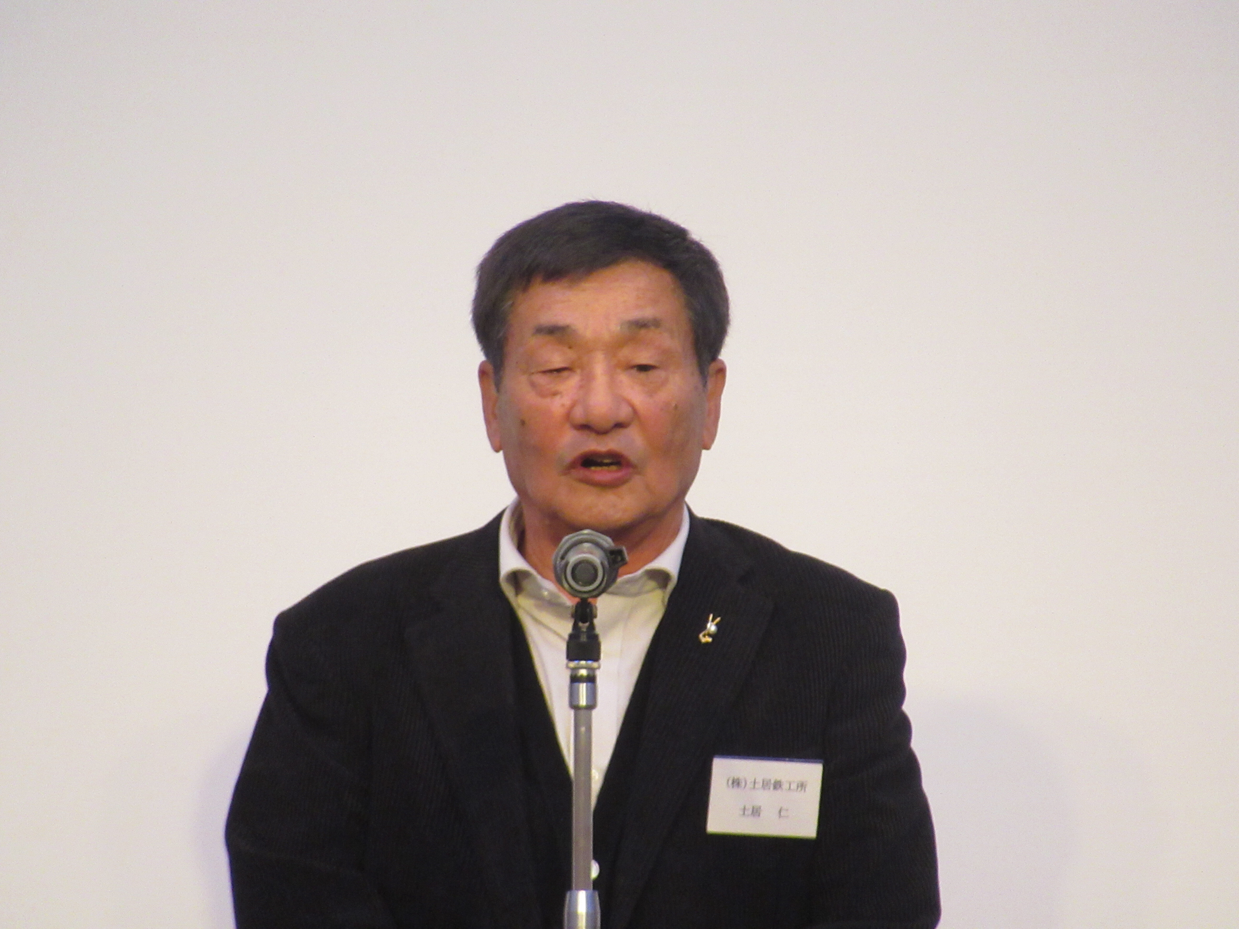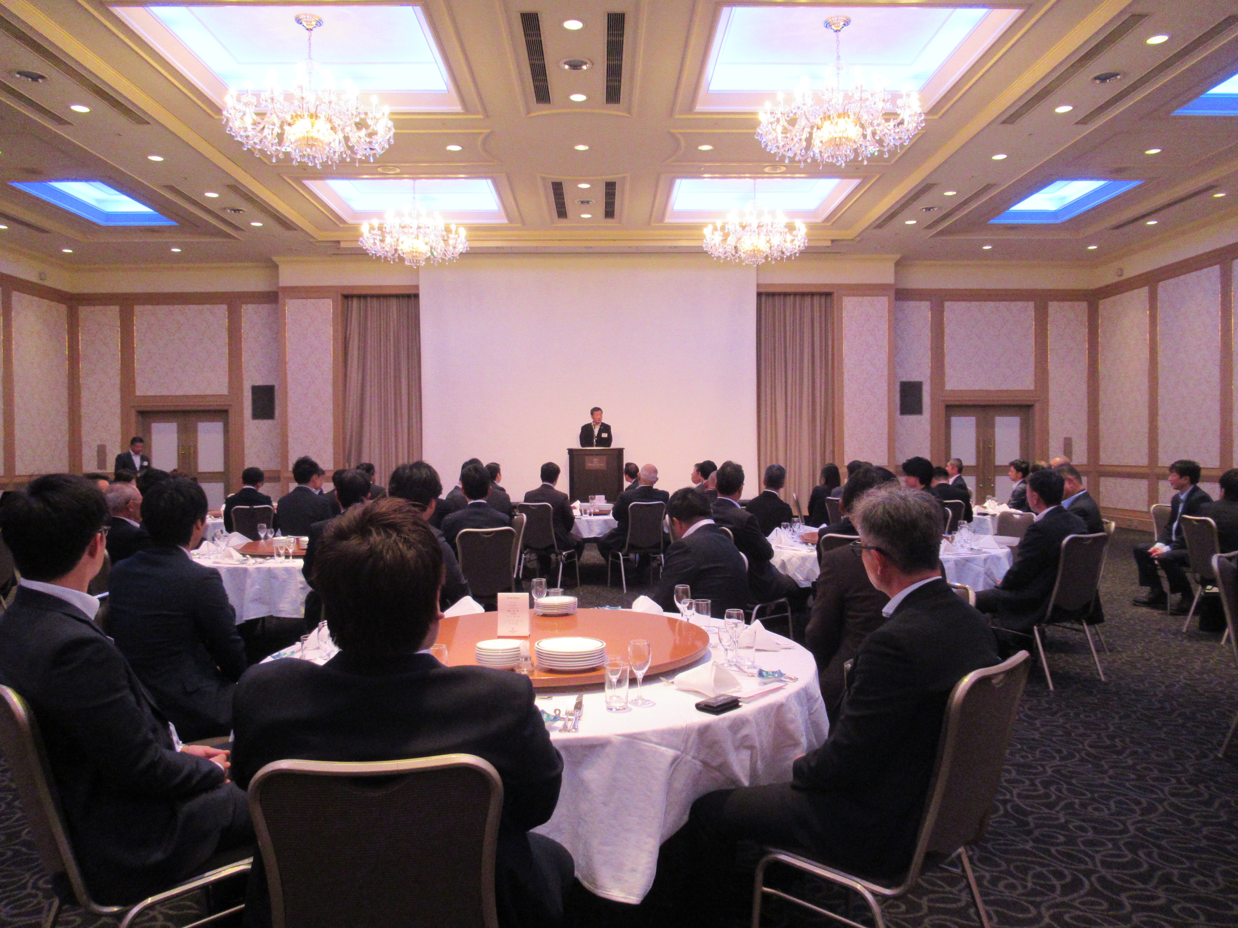 続く主催者挨拶で土居会長は、1ヶ月前開催の協会設立50周年記念祝賀会の盛会を謝すとともに、業界の人手不足・担い手不足に対し、女性や外国人の活用を含め特に技能者確保が重要であること、直ぐに実を結ぶものではないが高校生向けの協会活動も継続が必要なことを訴えつつ、意見を交わしながらの楽しい一夜にしたいと挨拶をしました。